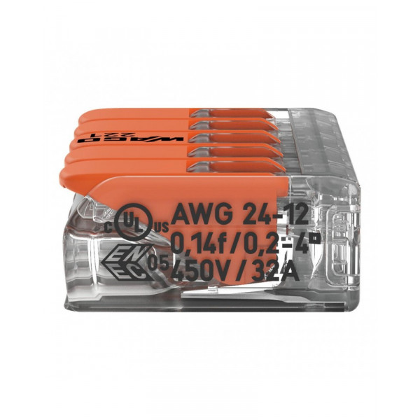 Сполучний затискач WAGO серії 221 з важелями вражає своєю інноваційною конструкцією для дротів різного перерізу. Саме тому сполучний затискач WAGO з важелями є унікальним товарним знаком у галузі технологій електричних з'єднань. Плоскі важелі, які легко входять в основу з'єднувача 221, в закритому стані діють як лита деталь і можуть бути акуратно розміщені в будь-якому корпусі, не ушкоджуючи краї. Завдяки широкій конструкції кожного важеля всі вони можуть бути легко встановлені без інструментів, забезпечуючи зручне підключення проводів. Прозорий корпус демонструє надійність конструкції та дозволяє миттєво візуально контролювати правильність контакту одножильних, багатожильних та тоншкірильних провідників. Дизайн важелів, що нагадує клавіші піаніно, ідеально поєднує в собі функціональність і естетичність технології з'єднання «Made by WAGO». Цей продукт розроблено для особливих умов експлуатації у вибухонебезпечних зонах.