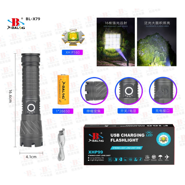 Ліхтарик-ручний "X-Balong" X79-XHP99 з акумулятором Li-Ion 26650 3.7V в комплекті Багатофункціональний, практичний та компактний ручний ліхтарик - це відмінний вибір та чудовий подарунок для друга чи близької людини. Корпус цього ліхтарика захищений від пилу, вологи та ударів, виконаний з анодованого алюмінію (завдяки якому він легкий та дуже міцний). При легкому натисканні на кнопку можна змінювати режими роботи ліхтарика (їх є три: повний, економ-режим, швидке мерехтіння). Характеристики: Акумулятор Li-ion 26650 (іде в комплекті) або Li-ion 18650 (не йде в комплекті) Зарядний пристрій: Micro-USB кабель Корпус: анодований алюміній Вага: 215 г (сам ліхтарик без акумулятора), з коробкою 400 г Оптичний зум: є Габаритні розміри: 160 (177) x45 мм Потужність свічення (сила світлового потоку): до 1500 люмен Джерело світла: X79-XHP99 Zoom (масштабування) від 1x до 2000x виконується легким рухом однієї руки. Фокусування променя здійснюється висування головки ліхтарика і дає можливість змінювати кут розсіювання світла від широкої плями до вузькоспрямованого променя. Комплектація тактичний ліхтарик X79-XHP99 зарядний пристрій Micro-USB кабель акумулятор Li-ion 26650 3.7V касета для використання 18650 шнурок-тримач упаковка