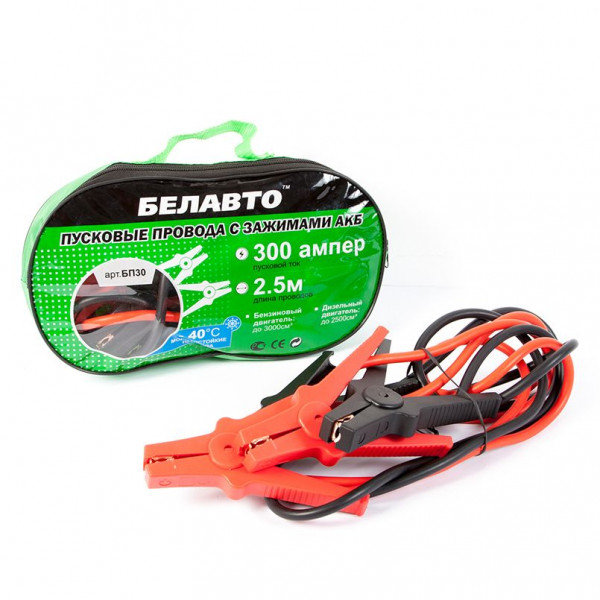 Пусковые провода Белавто используются для "прикуривания" аккумулятора автомобиля от АКБ другого авто. Морозостойкие, выдерживают температуру до -40 C. Поставляются в удобной сумке на молнии, инструкция по применению на обратной стороне. Пусковые провода предназначены для "прикуривания" автомобиля с максимальным пусковым током 300 А Ручки зажимов надежно изолированы резиновыми накладками Надежная обжимка кабеля обеспечивает качественную передачу тока без потерь Изоляция с добавлением силикона улучшает эластичность и морозостойкость