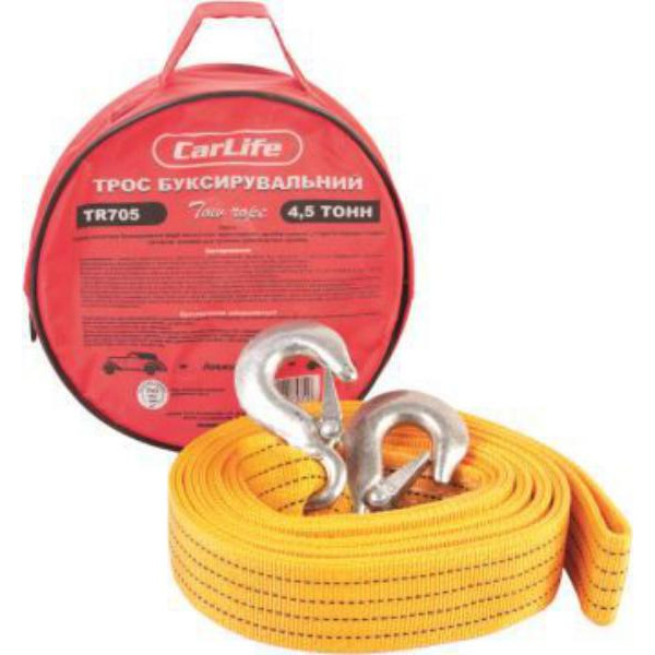 Трос буксирувальний з гаками CarLife TR705 Технічні параметри: Довжина: 5 м Вантажопідйомність: 4,5 т Ширина: 47 мм Колір: помаранчевий Вага брутто: 1 кг Габарити і тип упаковки: 210/210/50 мм, сумка Виробник: CarLife Країна: Польща Буксирувальний трос - постійний мешканець багажника більшості автомобілістів. Так склалося, що кліматичні умови і якість доріг України все частіше змушують до використання буксирувального тросу. То взимку снігом занесе і без сторонньої допомоги із замету НЕ вилізти, то сильний дощ застане Вас на дорозі, де й натяку на асфальтне покриття немає. Звідси і виникає необхідність постійно тримати буксирувальний трос "під рукою". Тому для автомобіля, який не має можливості пересуватися самостійно, найпростіший спосіб - це відбуксирувати його за допомогою іншого транспортного засобу. Буксирувальний трос має достатню для буксира довжину і рівень міцності.