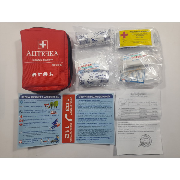 Комплектация набора: 1. Бинт марлевый не стерильный 7мх5см - 2шт 2. Презерватив-1шт 3. салфетка спиртовая-1шт 4. Лейкопластырь бактерицидный - 2шт 5. Вата нестерильная 25гр - 1шт 6. Новокаин 0,5%,2мл- 1 шт 7. Устройство для проведения искусственного дыхания рот в рот - 1шт 8. Шприц-тюбик - 1шт 9. Перчатки - 1 пара 10. Булавки английские - 2шт 11. Ватные палочки-2 12. Уголь актевированный №10-1 13. Zip пакет 50*70-1 14. футляр для аптечки-1 15. сертификат- 1шт