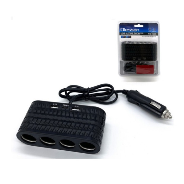 Автомобільний розгалужувач Olesson 1654, з подовжувачем,2USB/1Type-C Чорний 12/24V