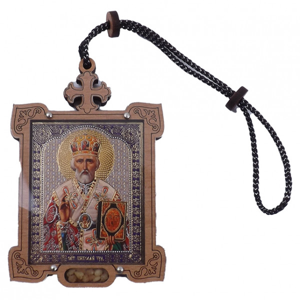 Ікона оберіг на нитці на дзеркало заднього виду МиколаЧудотворець квадрат дерево+ладан (5,6*6,5см)