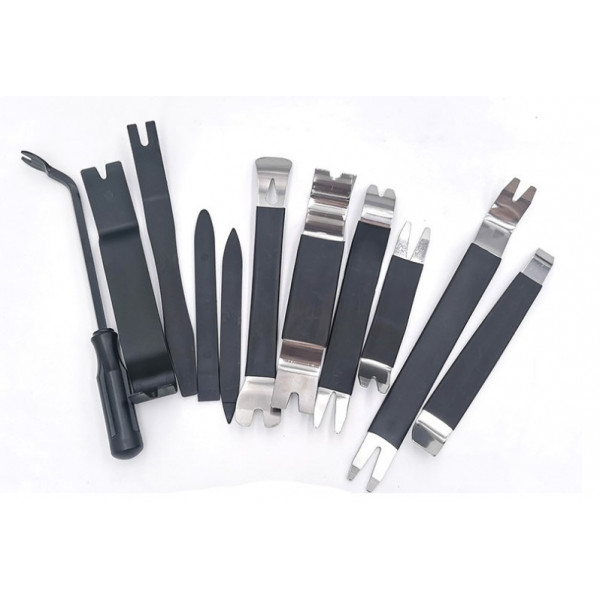 Набір для зняття обшивки панелі 11 од. (Zip пакет) №4 відноситься до групи спеціалізованого інструменту для сфери професійного ремонту автомобілів на станціях технічного обслуговування. Це набір спеціалізованого інструменту, який полегшує процес демонтажу дверних панелей, декоративних елементів облицювання, панелі приладів і т.д. Даний набір виготовлений з м'якого, але при цьому міцного полімеру та нержавіючого металу, вплив якого не завдає шкоди елементам облицювання та кріпленням. Комплектація: Знімач панелей облицювання - 11шт.