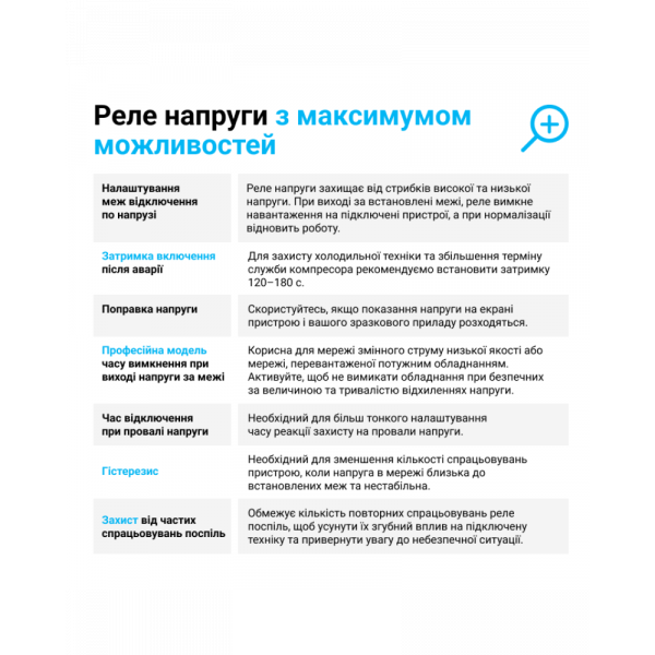 ZUBR D2 red позволяет настроить время задержки на включение нагрузки после аварии. По умолчанию от завода в реле стоит минимальная задержка на включение нагрузки 3 сек. В зависимости от типа вашего подключенного оборудования вы можете установить ее в диапазоне от 3 до 600 сек. Для чувствительного к частым отключениям напряжения оборудования, например, холодильников и кондиционеров рекомендуется устанавливать задержку включения 2-3 мин.