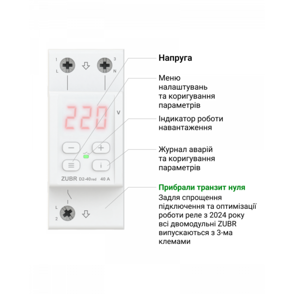 У ZUBR D2 red очень удобное стандартизированное подключение вход-выход, отсутствует необходимость использования нулевой клеммы при подключении. Настройка работы устройства осуществляется с помощью всего лишь трех кнопок. Четверная кнопка «i» предназначена для просмотра журнала аварийных срабатываний и расшифровки аббревиатур пунктов меню. Цифровой экран постоянно отображает значение напряжения, а также выводит системную информацию. Доступна возможность настройки яркости экрана и индикатора в режиме ожидания.