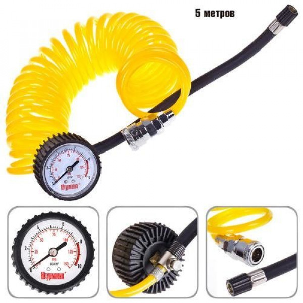 Шланг компресорний 5м перехід/манометр/жовтий (спіраль)/дефлятор "Штурмовик" АС-104