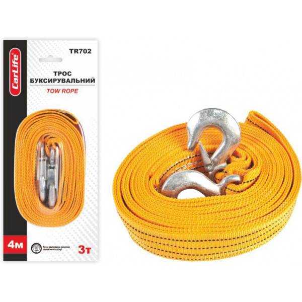 Трос буксирувальний з гаками CarLife TR702 Технічні параметри: Довжина: 4 м Вантажопідйомність: 3 т Ширина: 44 мм Колір: помаранчевий Вага брутто: 0,5 кг Габарити і тип упаковки: 300/130/50 мм, блістер Виробник: CarLife Країна: Польща Буксирувальний трос - постійний мешканець багажника більшості автомобілістів. Так склалося, що кліматичні умови і якість доріг України все частіше змушують до використання буксирувального тросу. То взимку снігом занесе і без сторонньої допомоги із замету НЕ вилізти, то сильний дощ застане Вас на дорозі, де й натяку на асфальтне покриття немає. Звідси і виникає необхідність постійно тримати буксирувальний трос "під рукою". Тому для автомобіля, який не має можливості пересуватися самостійно, найпростіший спосіб - це відбуксирувати його за допомогою іншого транспортного засобу. Буксирувальний трос має достатню для буксира довжину і рівень міцності.