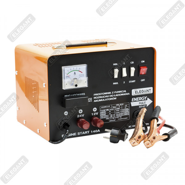 Опис Пуско-зарядний пристрій ELEGANT 101 417 призначений для акумуляторів 12V-24V та запуску двигуна при несправній АкБ. З цим зарядним пристроєм є можливість одночасного заряджання кількох акумуляторів. Характеристики: Місткість акумуляторних батарей; 30Аh-500Аh Максимальний вихідний струм; 45А Напруга зарядного пристрою; 12В/24В Номінальна потужність; 12В/30А - 24В/25А Вхідна напруга; 220-240V змінного струму 50Гц Вихідна напруга; 12В/500Вт; 24В/1000Вт Функція запуску (СТАРТ); 140А Довжина кабелю до заряджання; 1,9 м Довжина кабелю живлення; 1,6 м Особливості: ефективний, зручний та безпечний; амперметр показує стан заряду; захист від перенапруги (занадто великого струму, що подається на акумулятор); захист від коротких замикань між затискачами кабелю; захист від зворотної полярності акумулятора