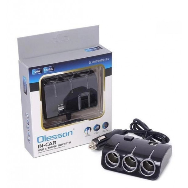 Автомобільний розгалужувач Olesson 1506, з подовжувачем.USB.підсвітка.Чорний,1-вимикач