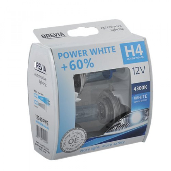 Лампа 12V H4 60/55W 4300K + 60% Power White "Brevia" (Box-2шт) (12040PWS) (9шт/уп)
