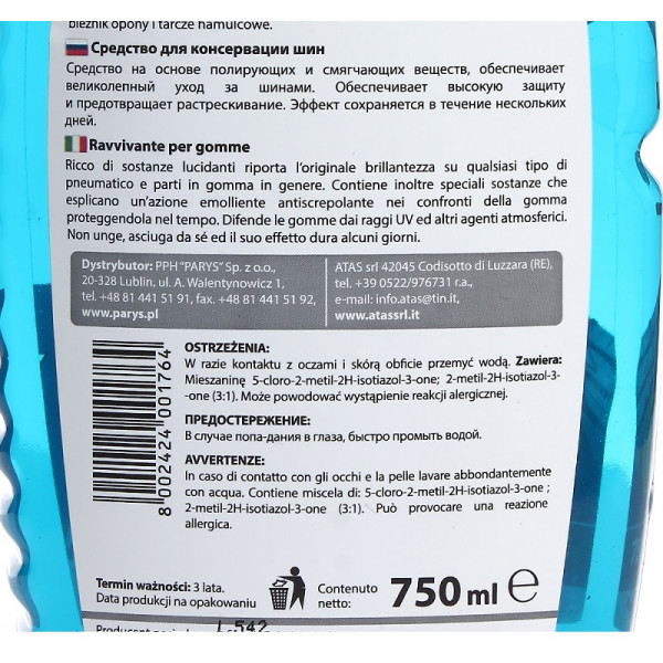 ATAS PNEUBELL 750мл - захисний засіб для шин Комплексний засіб для очищення, надання глянцю і захисту покришок автомобіля. Універсально підходить для всіх видів і розмірів шин, а також для гумових ущільнювачів і молдингів. Завдяки активній піні, очищувач всього за одну обробку усуває будь-які забруднення покришок, включаючи дорожній наліт, сліди від гальмівної рідини, жирні і маслянисті плями і багато інших, забезпечуючи виняткову чистоту. Також, засіб ефективно відновлює насиченість забарвлення покришки, надає їй ефектний глянцовий блиск. Особливістю рідини є її здатність закладати мікротріщини в гумі і запобігати їх повторній появі або розширенню, істотно продовжуючи термін служби покришки. Переваги: Швидко і делікатно усуває більшість дорожніх забруднень, включаючи найскладніші, всього за одну обробку. Надає гарний колір і блиск гумі, покращуючи її зовнішній вигляд. Захищає від негативного впливу прямих сонячних променів, води, солі та інших зовнішніх факторів, продовжуючи термін служби гуми. Не має запаху. Зберігає свої властивості на дуже тривалий термін. Упаковка у формі спрею забезпечує зручне нанесення і економну витрату очищувача.