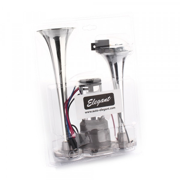 Особливості: Надзвичайно гучні, хромові труби (не іржавіють). Легко встановлюється, не потрібна система подачі повітря. Підходить для автомобілів, вантажівок, човнів, мотоциклів, тощо на 12/24 В. Кріпильні гвинти та кронштейни в комплекті. Специфікація: Колір: срібний Вихідний рівень децибел: 95≤110 дБ Частота: 530/680 Гц Напруга/Струм: 12В/30А,24В/12А Спеціальна функція: Подвійний трубний повітряний сигнал Розмір трубок: 210/270 мм Пакет включає: 1 х Подвійний сигнал + Повітряний компресор 1 x Пакет кріплень 1 х реле