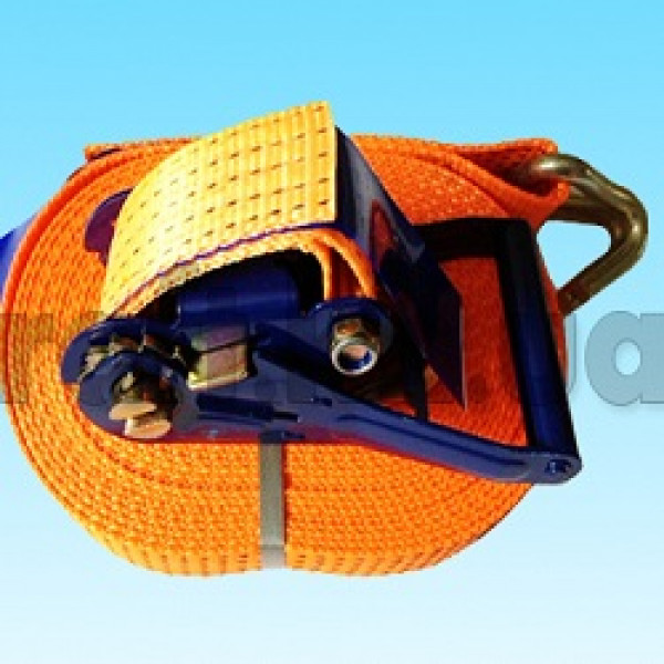 Стяжний ремінь або ретчет використовується для безпечного та надійного кріплення різних вантажів під час перевезення. Складається зі стрічки, гаків та тріскачки (храпового механізму), призначеного для натягу стрічки. За рахунок натягу стрічки стяжні ремені виключають переміщення та сповзання вантажу під час транспортування. М'яка стрічка з поліестеру не пошкоджує та не дряпає вантаж та упаковку. Відповідають європейському стандарту ДСТУ EN 12195-2:2018. У стандартному виконанні ремені комплектуються звареними гаками. Спектр застосування стяжних ременів для кріплення вантажу з храповим механізмом: фіксація вантажу на автомобілі та судах; кріплення вантажу на причепах та залізничних платформах. Фіксований вантаж повинен стійко розташовуватися на платформі. Для виключення деформації ременя, забороняється піддавати його навантаженню вище за допустиму норму, яка вказана виробником. При виборі ременів слід звернути увагу на: вага, розмір, вид та форму вантажу, тип кріплення конструкцію елементів кріплення; інформацію, вказану на бирці. До переваг ременів відносять: мінімальне розтягування при навантаженнях; ремонтопридатність; невелика вага; зручність та безпека використання; стійкість до механічних ушкоджень; легкість регулювання довжини ременя з допомогою наявності храпового механізму; несприйнятливість до впливу високої/низкої температури та підвищеної вологості; стійкість до вигоряння під впливом сонячних променів. Характеристики: довжина: 8 м ширина: 50 мм тягове зусилля: 3 т