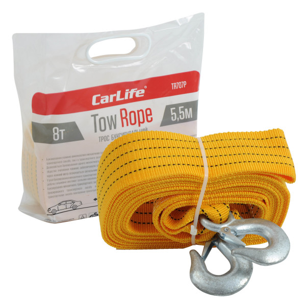 Трос буксирувальний 8,0т 5,5м 75мм/гаки/помаранч./Пакет-РЕ "Carlife" (TR-707Р) (10 шт)