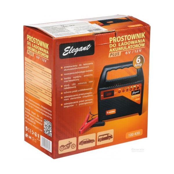 ОПИС: Зарядний пристрій Elegant Compact EL 100 430 підійде для заряду, як автомобільних акумуляторів з напругою 12В, так і мотоциклетних акумуляторних батарей з напругою 6В. Цей апарат може заряджати і свинцево-кислотні і гелеві акумулятори. Головною особливістю Elegant Compact EL 100 430 є простота використання і невибагливість в роботі. При підключенні до батареї необхідно дотримуватись полярності, червону "прищіпку" під'єднати до плюсової клеми, чорну - до мінусової, після чого необхідно увімкнути пристрій в мережу змінного струму 220В і вибрати необхідний режим зарядки. Після закінчення процесу зарядки, Elegant Compact EL 100 430 включить відповідний індикатор. Кнопки перемикання режимів роботи і інформаційні світлодіодні індикатори розташовані на передній панелі пристрою, що забезпечує зручний контроль за процесом зарядки. Низька вага і компактні розміри, роблять цей пристрій портативним і дозволяють взяти його з собою в будь-яку поїздку. Корпус з пластика, надійно захищає електричні елементи від пошкоджень під час транспортування і експлуатації. Перед використанням необхідно ознайомиться з інструкцією. ХАРАКТЕРИСТИКИ: Вихідна напруга: 50 Гц Частота змінного струму: 230-240 В Вихідна напруга: 6 / 12В; 3,52А Потужність: 64 Вт Зарядний струм: 6 А Ємність батареї: 20-120 Аг Довжина кабелю живлення: 1,7 м Довжина кабелю для зарядки: 1,4 м Вага брутто: 1,6 кг Габарити упаковки, мм: 185/200/100