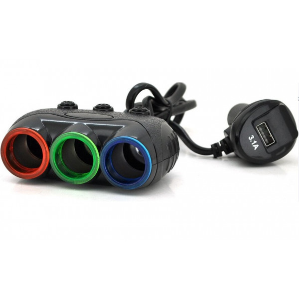 Автомобільний розгалужувач Olesson 1633 на 3 виходи прикурювача з кнопкою вимкнення 3-х прикурювачів + 1 USB входу на 5V-3100mA, LCD дисплей індикації батареї. Один USB порт силою струму 3.1 А і три роз'єми прикурювача OLESSON 1633 потужністю 120 Ватт дозволять підключити до 4-х пристроїв одночасно. Система кріплення в роз'ємі прикурювача дуже надійна. Придатний для використання як у легкових, так і у вантажних автомобілях, у яких вихідна/вхідна напруга різна - 12В та 24В відповідно. Виробником передбачено захист від короткого замикання. Важливою особливістю розгалужувача є величина струму, що забезпечує USB-порт: 3.1 А. Цей показник гарантує швидку і ефективну зарядку будь-якої техніки. Специфікації: Розгалужувач гнізда прикурювача, на 3 входи 120W; 1*USB - 5V/3100mA Матеріал: пластик Напруга: 12-24В