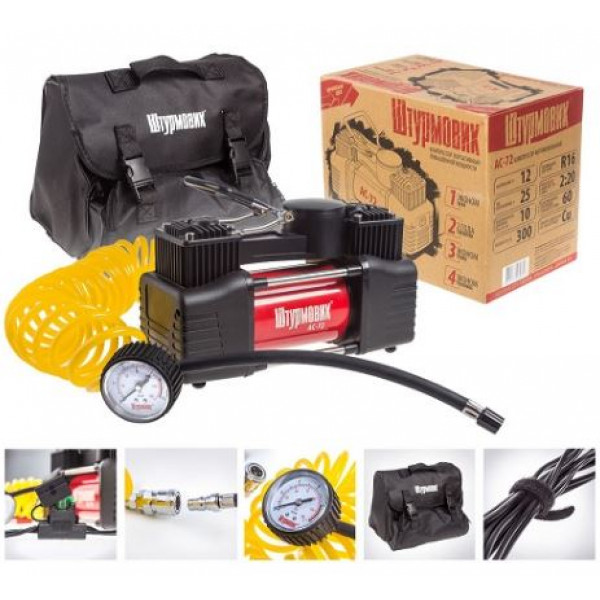Для автолюбителя, важна удобная и безопасная эксплуатация автомобиля. По разным причинам давление в автомобильных шинах становится меньше нормального уровня. Иногда, даже покупка дорогой и качественной резины не страхует от прокола шины, или от факта, что рано, или поздно сжатый воздух может начать проникать через стенки покрышки. Каждый автомобилист должен знать как справится с этой головной болью. Поэтому автомобильный компрессор Штурмовик AC-72 - является неотъемлемой вещью в транспортном средстве. Компрессор AC-72 одной из мощнейших двухцилиндровых моделей, мощностью в 300Вт, способствующий нагнетать воздух до 10атмосфер(кг/см2), что позволит без проблем поднять давление в шинах , радиусом R17 и выше. Также он довольно быстро накачает колесо, размером R16, всего за 2:20 минут, этому способствует производительность в 60л/минуту. Манометр, расположенный на шланге, что позволит эффективно контролировать давление внутри колеса. Для подключения компрессора к колесу автомобиля используется длинный спиральный шланг, длиной 5м. Питание прибора осуществляется через кабель питания, путем подключение аккумуляторных клемм к АКБ. Корпусе цилиндра выполнен из прочного метала, высокого качества, что обеспечит длительный срок службы прибора. Ручка довольно широкая, что обеспечит удобный и прочный захвата. В комплекте идет тканевая сумка, для комфортного хранения и транспортировки. Для настройки давления в шинах, компрессор укомплектован дефлятором. Технические характеристики• Вид: двухпоршневой• Напряжение: 12В• Потреблеие тока: 25А• Мощность: 300Вт• Максимальное давление: 10Атм(150PSI)• Производительность: 60л/минуту• Длина провода питания: 3м• Длина шланга: 5м• Температура эксплуатации: от -40 до +80 С Комплект поставки:• Компрессор Штурмовик AC-72• Спиральный шланг• Комплект адаптеров(3ш)• Дефлятор• Тканевая сумка• Картонная коробка