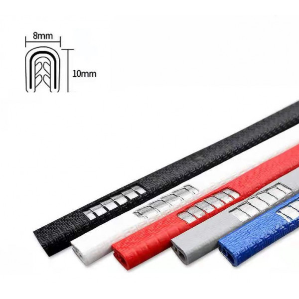 Усиленная защитная лента для предотвращения сколов, царапин, ударов на кромке дверей. Лента выполнена из PVC материала с металлическими скобами внутри. Надежно фиксируется на дверях. Легко устанавливается и обрезается под нужную длину. Не спадает, не отваливается, не дубеет на морозе. Характеристики: Ширина верх: 8 мм. Ширина низ: 5 мм. Высота: 10 мм. Длина - 5 метров