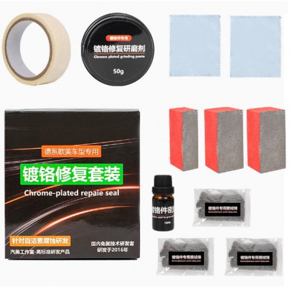 Набір для відновлення хрому Chrome Plated Repair Seal призначений для реставрації та захисту хромованих поверхонь. Цей набір дає змогу ефективно усувати подряпини, потемніння й інші типи пошкоджень на хромованих деталях автомобілів, мотоциклів, велосипедів, а також побутової техніки та сантехніки. Комплектація: Абразив для ремонту хрому 50гр Герметик для запобігання окисленню 10гр Вата для протирання 3 шт Губка-брусок з кристалічним покриттям 3 шт Малярська стрічка 1 рулон Замшева тканина 2 шт Інструкція