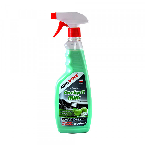 Очисник для приладової панелі транспортного засобу Cockpit Milk Яблуко AD0069 500мл необхідний для забезпечення комплексного догляду за панеллю приладів автомобіля, при цьому ефективно усунути різноманітні забруднення, замаскувати дефекти та захистити елементи від налипання пилу та дії води. Виготовляється такий очищувач без шкідливих розчинників або силікону, завдяки чому цей засіб універсально підходить для всіх видів пластмас, включаючи гладкі та текстуровані пластмаси. Достатньо велика упаковка з професійним розпилювачем гарантує користувачу максимальну ефективність засобу, а також тривалий термін експлуатації. Очищувач для пластикових елементів не вимагає попереднього розведення або підготовки поверхні для очищення. Необхідно лише нанести невелику кількість засобу на поверхню деталі та відполірувати серветкою з мікрофібри. Переваги та особливості очищувача: Має миючі властивості, а також легко та ефективно усуває різні забруднення, такі як пил, жирні плями, тютюновий наліт та інші. Відновлює колір пластику, надає привабливого вигляду. Маскує невеликі подряпини та потертості, поверхня стає гладкою. Перешкоджає налипання пилу у майбутньому.