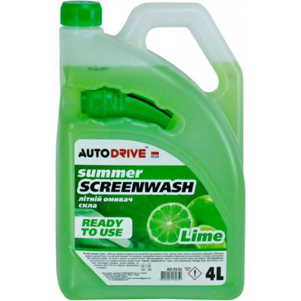 Auto Drive Summer Screen Wash Lime AD0131 може використовуватися для ручного очищення дзеркал, оптики фар, заднього та бокового скла від складних забруднень, а також для догляду за вікнами та дзеркалами в побуті. Опис: Готова рідина омивача скла з поліпшеними властивостями, що очищають. Дозволяє швидко очистити лобове скло автомобіля від дорожнього пилу, слідів мошок, сольового нальоту, а також жирних та маслянистих плям. Ефективно видаляє забруднення, після чого випаровується з поверхні скла, не залишаючи на ньому плям або смуг, забезпечує ідеальну прозорість скла для безперешкодного огляду та комфортного керування автомобілем. Не містить у складі агресивних інгредієнтів, зокрема - ацетону чи сірчаної кислоти, завдяки чому є абсолютно безпечною для лакофарбового покриття, деталей із пластмас, гуми та щіток склоочисника. Переваги: Не вимагає розведення водою перед заливкою. Має приємний і ненав'язливий аромат "Lime". Ефективно проти більшості дорожніх забруднень, включаючи жирні плями та сліди мошок. Не залишає плям на склі після очищення. Безпечна для лакофарбового покриття, гумових ущільнювачів та елементів із пластмас. Не викликає корозії елементів системи.