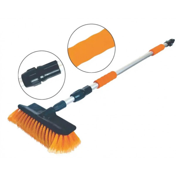 Щітка для миття з телескопічною ручкою 98-168 см Elegant EL 100 132 Щітка для миття кузова з алюмінієвою телескопічною ручкою і клапаном для підключення води. Дозволяє спростити завдання догляду за великогабаритними транспортними засобами, такими як автобуси, фургони та вантажівки або їх причепи. Густа м'яка щетина ефективно видаляє більшість дорожніх забруднень як з площин, так і місць стиків дверей і вікон, забезпечуючи виняткову чистоту поверхонь. Не ушкоджує лакофарбове покриття навіть при інтенсивному очищенні із застосуванням сили. Щетина нейтральна до впливу будь-яких миючих засобів, завдяки чому володіє дуже тривалим терміном служби. Спеціальні поролонові накладки на ручці забезпечують зручний хват інструменту і не допускають його вислизання навіть з мокрих рук. Переваги та характеристики: Алюмінієва телескопічна ручка із змінною довжиною від 98 до 168 см дозволяє мити навіть дуже високі транспортні засоби. Ширина щітки 25 см Має перемикач водяного потоку і швидкознімний з'єднання єднувач. М'яка, густа щетина не ушкоджує лакофарбове покриття і скло. Має поролонові накладки на ручці. Підходить для використання з усіма видами автошампунів. Відмінно видаляє більшість дорожніх забруднень. Стійка до механічних впливів і володіє необмеженим терміном служби.