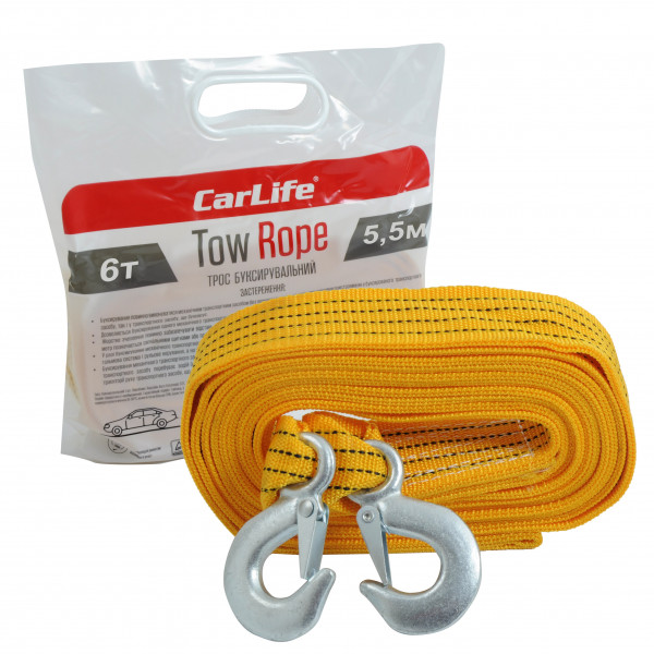 Трос буксирувальний 6,0т 5,5м 50мм/двошаровий/гаки/помаранч./Пакет-РЕ "Carlife" (TR-704P)