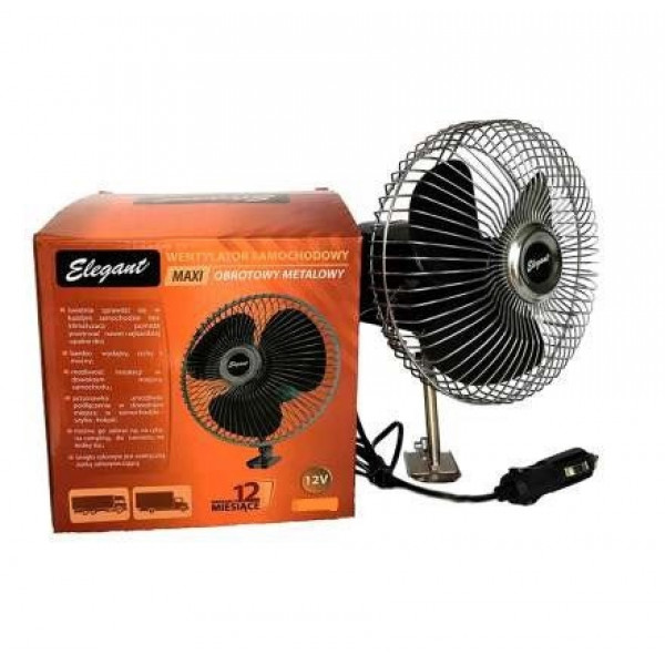 Автомобільний вентилятор Elegant MAXI EL 101 543 має 1 швидкість та функцію повороту. Пластиковий автомобільний вентилятор створить комфортну атмосферу в салоні авто в жарку пору року. Чудово підходить для будь-якої машини 24В без кондиціонера завдяки компактному розміру та низькому енергоспоживання. Кріплення - металевий кронштейн (входить до комплекту). Конструкція з однією головкою, що обертається, яка повертається на 60 градусів. Вентилятор має діаметр 15 см (6 дюймів). Вентилятор - ефективний, тихий та потужний. На кінці дроту є штекер для гнізда прикурювання на 24В, за допомогою якого вентилятор вмикається/вимикається. Характеристики: Напруга: 24 В Потужність: 3 Вт Запобіжник: 2 А Діаметр: 6" (15 см) Рівень шуму: 50 дб Довжина кабелю: 2 м Регулювання: 1 швидкість