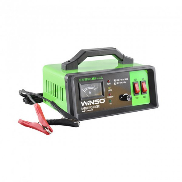 Опис: Зарядний пристрій для АКБ Winso 139400 - переносний однофазний пристрій для побутового та професійного використання. Призначений для заряджання свинцево-кислотних АКБ напругою 12/24 B. Зарядний пристрій Winso 139400 оснащено системою захисту від короткого замикання, захистом від перезаряджання та функцією безперервного підзаряджання. Під'єднують до мережі з напругою 220 В, споживає 280 Вт за годину. Winso 139400 з клемами акумуляторної батареї з'єднують роз'ємами-крокодилами що подовжуються дротами довжиною 1,7 м. Панель керування пристроєм є досить простою та інформативною. На ній розміщено перемикач ON-OF, 12-24V, амперметр та світлодіодні індикатори. Основні технічні характеристики: Вихідна напруга визначає сумісність зарядного пристрою з вашим акумулятором. Вольтаж АКБ має збігатися з можливостями пристрою, в іншому разі акумулятор вийде з ладу. Це значення може становити 12 В для легкових і малотоннажних вантажних автомобілів, і 24 В для великих вантажних машин. Струм заряджання вибирається з огляду на ємність акумулятора. Наприклад, для свинцевого АКБ, ємністю у 150 А·год у звичайному режимі рекомендується струм зарядки в 15 А. Не забувайте про дотримання полярності. Параметри: Вхідна напругаAC 230V, 50Hz Вихідна напругаDС 12V/24V Ємність АКБ5-150 Ah Потужність280 Вт Струм зарядки5-15 А